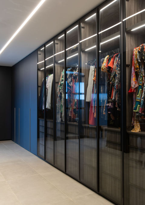 AMARA’s interiors are defined by dramatic contrasts: dark architectural finishes balanced with warm lighting and natural textures. The main staircase is a centrepiece — a sculptural element suspended in space, lit with refined precision, making movement through the home a sensory experience. Pendant lighting installations draw the eye upward, reinforcing the sense of scale and verticality while adding theatrical beauty to the double-volume spaces.
